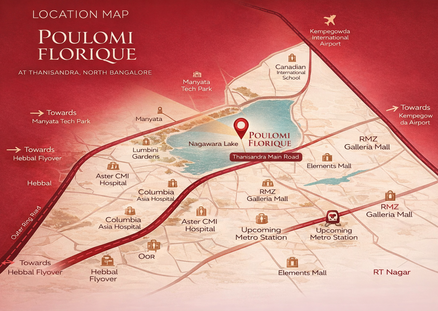 Poulomi Estates Pvt. Ltd. is a reputed real estate developer headquartered in Hyderabad, with over two decades of experience in delivering premium residential projects. Established in 2005, the company has steadily built a strong presence in the Hyderabad market, focusing on high-quality construction, thoughtful design, and customer-centric development. Over the years, Poulomi Estates has developed millions of square feet of residential space, primarily catering to the premium and upper mid-segment housing category. The developer is known for its emphasis on spacious layouts, modern architecture, and well-planned communities that enhance everyday living. Rather than focusing on compact or budget housing, Poulomi Estates positions itself in the premium segment, offering larger apartments, gated communities, and lifestyle-oriented developments. Their projects typically feature high-rise towers, ample open spaces, and a comprehensive set of amenities designed to meet the needs of urban families. A key aspect of Poulomi Estates’ philosophy is its commitment to delivering “peace of mind” to homebuyers. This is reflected in their focus on construction quality, transparency in transactions, and timely execution. The company aims to create not just homes, but long-term residential environments that offer comfort, functionality, and value appreciation over time. With the launch of projects like Poulomi Florique, the developer has expanded into the Bengaluru real estate market, particularly targeting high-growth corridors such as Thanisandra in North Bangalore. This strategic move marks their entry into one of India’s most competitive housing markets, where they aim to replicate their Hyderabad success by delivering premium residential developments near major IT hubs and infrastructure zones.